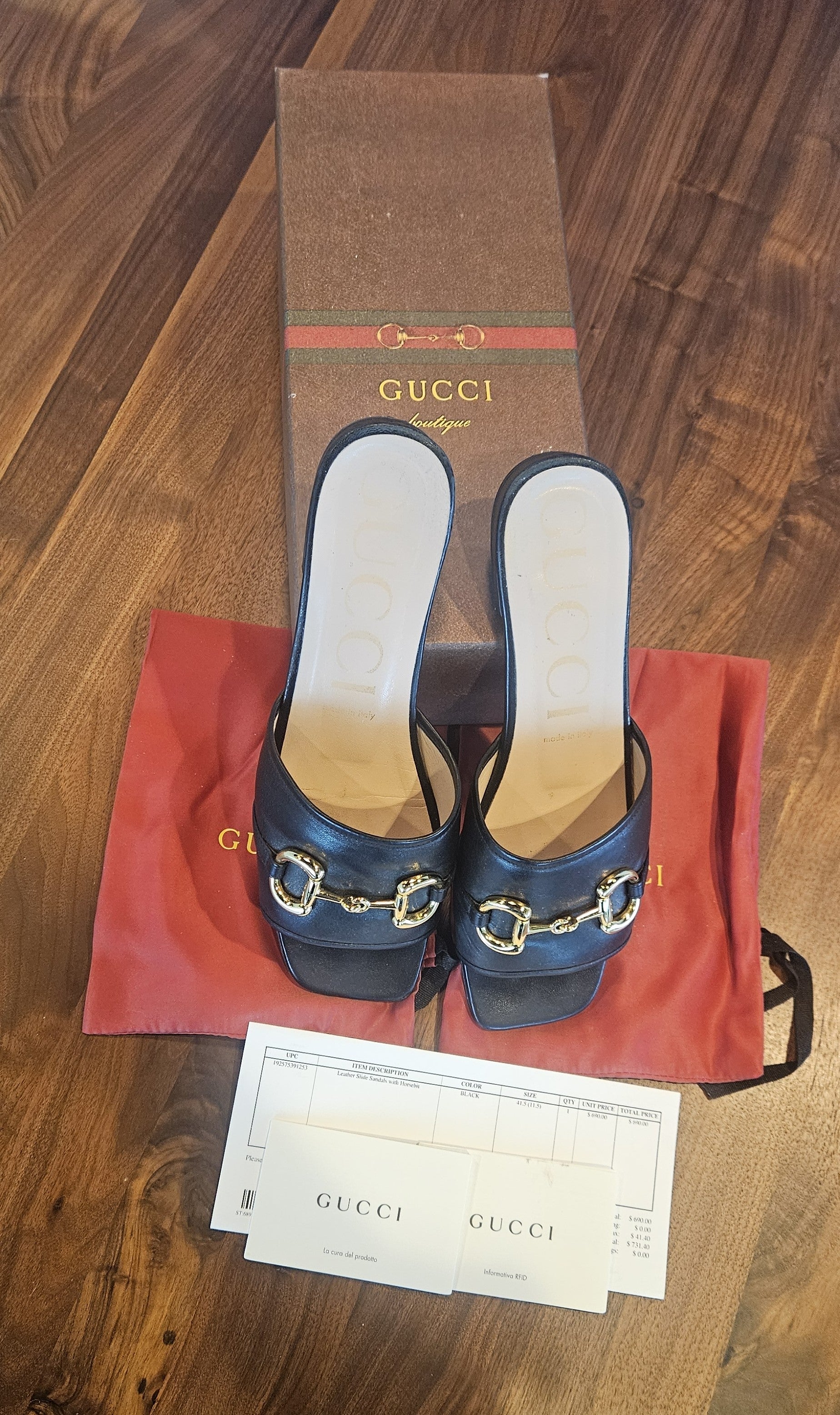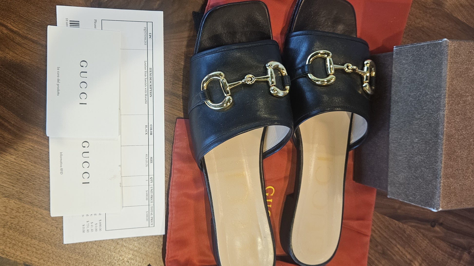 Black Leather Slide Gucci Sandals with Signature Gold Horsebit Hardware EU 41.5/ US 11.