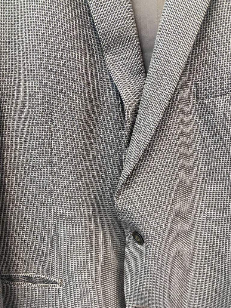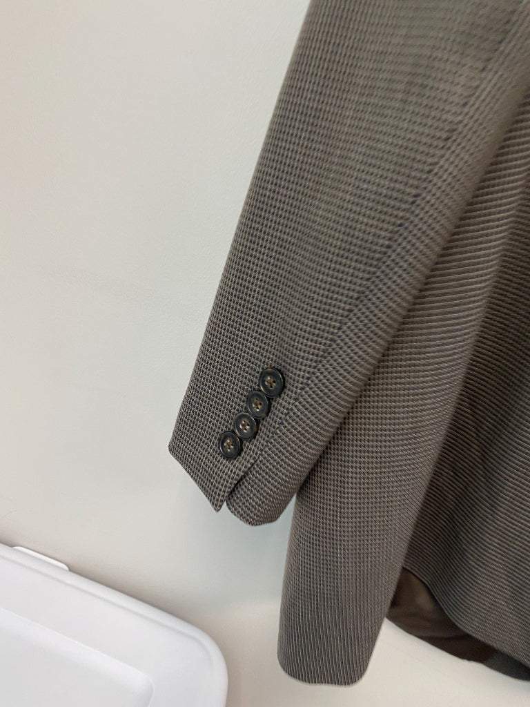Description : Gray sport coat with brown stripes. Dark gray and black buttons