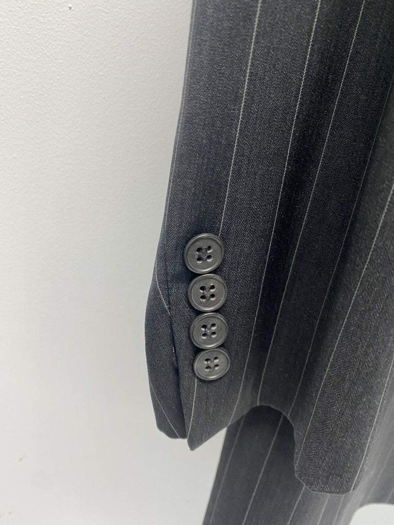 Description : Gray suit with white threading going through pant and jacket. Gray hardwear
